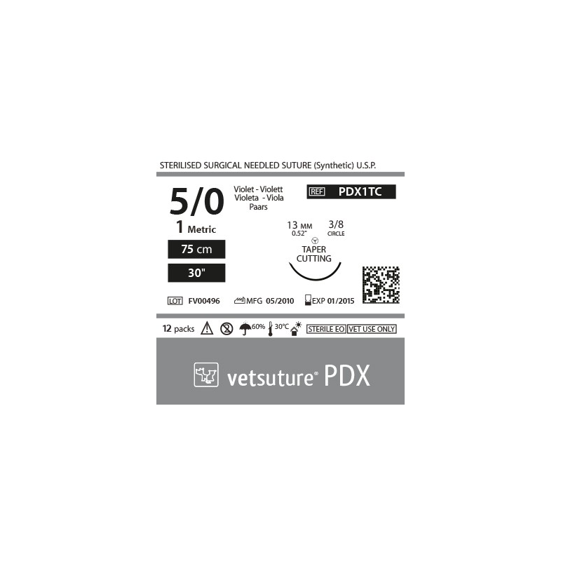Plus de détails sur le fil de Suture PDX VetSuture® monofilament (Polydioxanone) Le PDX VetSuture® est une suture résorbable stérile préparée depuis le polyester, poly(p-dioxanone). La formule empirique du PDX VetSuture® est (C4H6O3)n. 70% de la force originale de résistance à la traction est maintenu jusqu'à 14 jours après la chirurgie. 50% de la force originale de résistance à la traction est maintenu à la fin de la 4e semaine après l'implantation, et à 6 semaines, 25%. La résorption du PDX VetSuture® est minimale (jusqu'à 10%) à 90 jours. La résorption est quasi-complète en 6 mois. Le PDX VetSuture® est coloré avec D&C Violet.